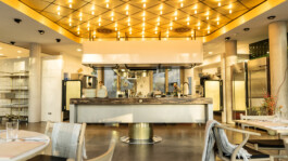 Das Labor. Tim Mälzer präsentiert mit der Guten Botschaft in Hamburg eine Lamborlandschaft, die die Experimentierküche auf ein neues Niveau transferiert. Hochwertige, von Glanz geprägte Materialien erinnern an den Laborcharakter, während unter der goldenen Leuchtdecke die Showküche in Szene gesetzt ist. Bis ins kleinste Detail wird das Labor-Konzept auf das Interior Design übertragen, sodass im Sanitärtrakt rot leuchtende Fugen den Anschein erwecken, der Besucher befindet sich in einer Fine Dinging Klinik.