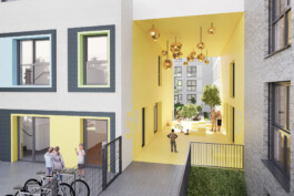 Architektonisch schiebt sicher der Gebäuderiegel der KiTa vom Wohnkomplex weg. Mit ausgewählten Farbelementen und einer klaren Ausrichtung nach Innen hebt sich die individualisierte Fassade der KiTa gestalterisch von den übrigen Gebäuderiegeln ab.